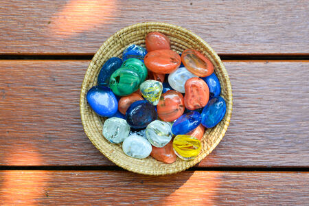 Glass pebbles in the bucket on wood floor