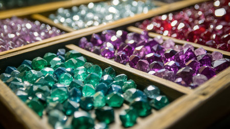 bright, cut gemstones on a leather surface, created with generative ai