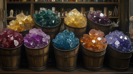 A stunning display of colorful crystals fills wooden buckets in a magical shop, showcasing vibrant hues and textures, perfect for art or decor themes.