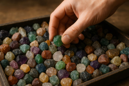 A close-up of hands selecting vibrant decorative gems from a tray, showcasing a variety of colors and shapes in a creative workshop environment.