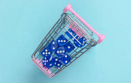 Dice in a mini supermarket trolley on a blue background