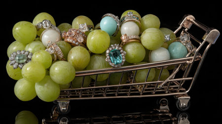 A visually striking composition featuring green grapes paired with an array of vibrant rings in a mini shopping cart, blending the essence of nature and luxury.