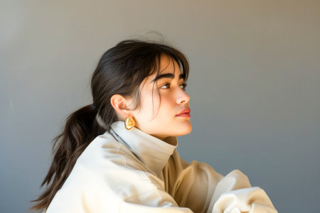 A contemplative young woman gazes slightly upward neon yellow wires framing her delicate face. The soft light creates an ethereal quality highlighting her thoughtful expression and.