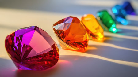 A stunning array of colorful gemstones arranged in a line, showcasing their vibrant hues and brilliant facets, creating mesmerizing reflections and shadows.