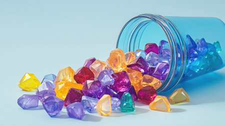 A stunning arrangement of colorful decorative gems spills from a clear jar against a light blue backdrop, creating a vibrant and playful atmosphere perfect for creative projects.