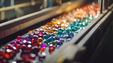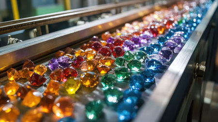 A vivid display of colorful decorative gems arranged neatly on a conveyor belt captures the essence of craftsmanship and industrial beauty.