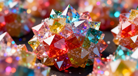 A creative digital illustration depicting Intricate digital rendering of candy crystals growing in geometric clusters, sparkling multicolored facets, crisp studio lighting, playful abstract food art. This AI-generated artwork features unique visual elements suitable for various commercial and editorial applications. AI-generated illustration.