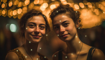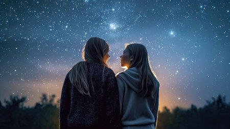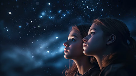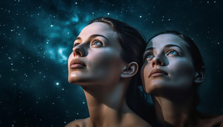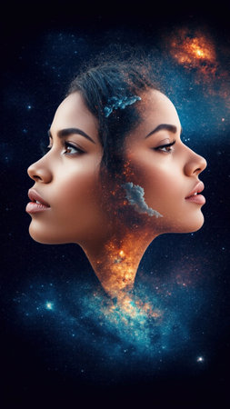 Double exposure of two women merging with the cosmic galaxy, symbolizing unity, beauty, and infinite possibilities