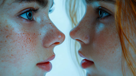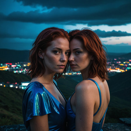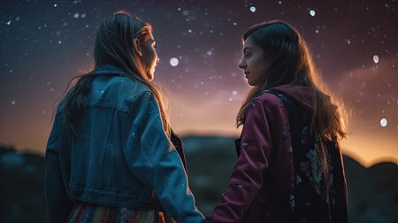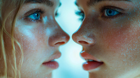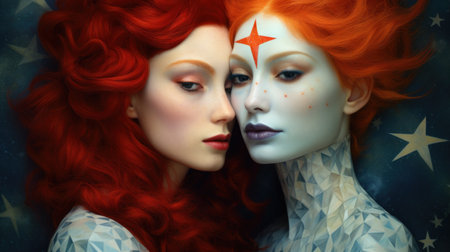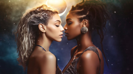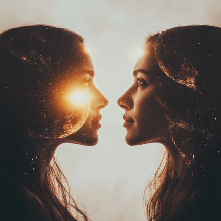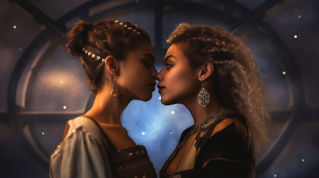 Two women with glowing cosmic elements in their faces engage in a captivating gaze creating a surreal and artistic atmosphere.