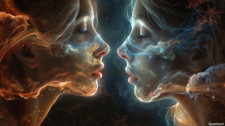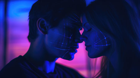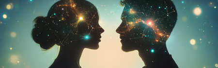 Digital art illustrates two figures facing each other, surrounded by glowing lights and cosmic patterns, symbolizing connection and love in a modern style.