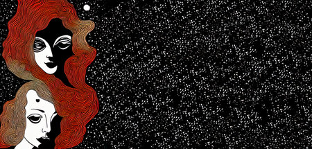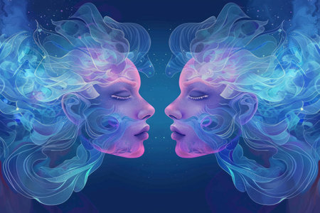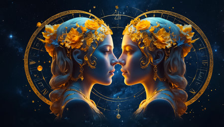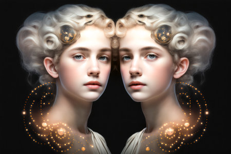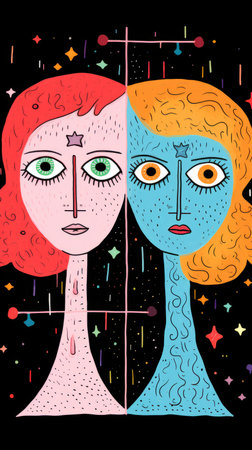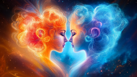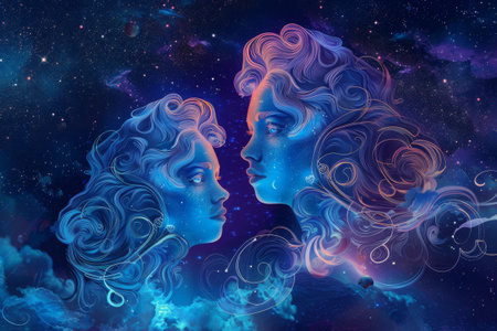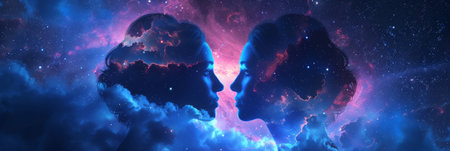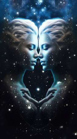 Abstract Gemini zodiac sign in cosmic harmony. Two mirrored Gemini faces merge in a swirl of stars and nebulous colors.