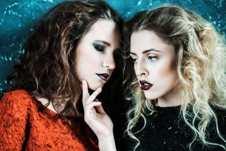 Young happy lesbian lgbtq couple of women friends together, having fun together.