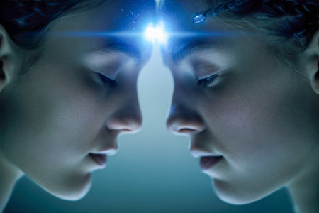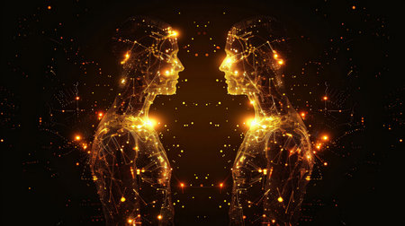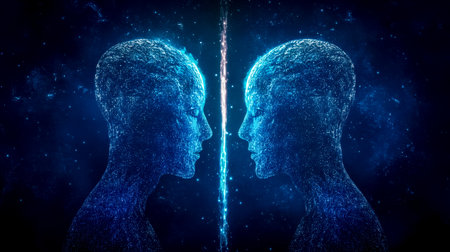 A futuristic close-up of two human faces reflecting each other, with glowing blue circuits and data flowing across their faces, representing artificial intelligence and machine learning.