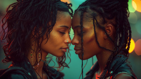 Two women with braided hairstyles are gently touching foreheads in a colorful urban environment, showcasing a deep emotional connection.
