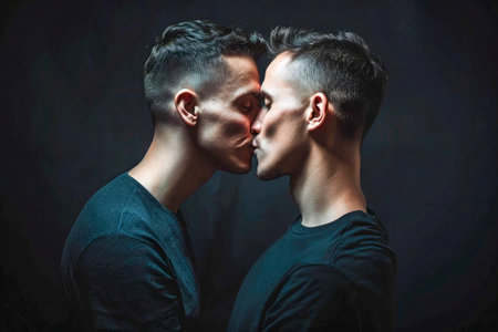 portrait of beautiful happy cheerful gay couple kissing on dark background