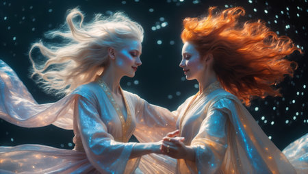Two ethereal figures with flowing hair engage in a graceful dance amidst a shimmering backdrop