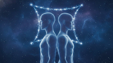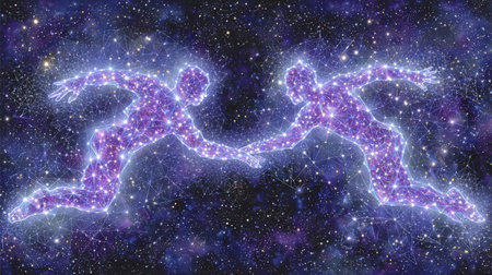Illustration of the Gemini zodiac sign with two glowing figures connecting in a cosmic setting, filled with stars and intricate patterns in the background