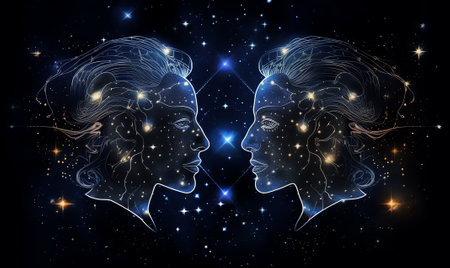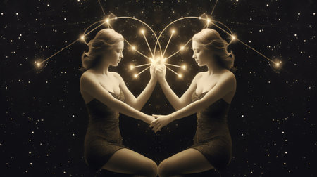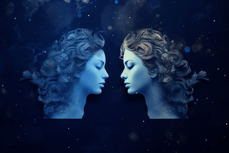 Gemini Zodiac Sign, Horoscope Symbol, Magic Astrology Twins, Gemini in Fantastic Night Sky, Copy Space, Generative AI Illustration
