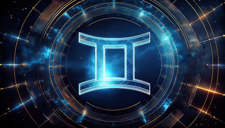 A vibrant depiction of the Gemini zodiac symbol illuminated with cosmic elements filling the surrounding space.