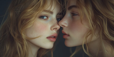 Two women with blonde hair lean toward each other, their faces close, expressing affection and connection. The soft light highlights their features, creating a warm and intimate atmosphere.