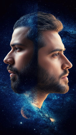 Surreal digital artwork, two men in profile, mirroring each other against a star-filled galaxy. Duality, introspection, parallel realities. For sci-fi themes, artistic prints, conceptual projects
