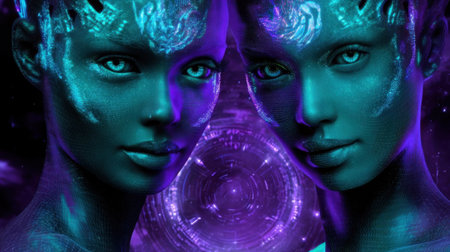 Cosmic gemini twins with vibrant neon colors for astrology and zodiac themes