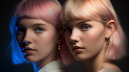 Portrait of two beautiful young women with pink hair. Studio shot.