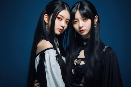 Two beautiful asian women in gothic style on blue background