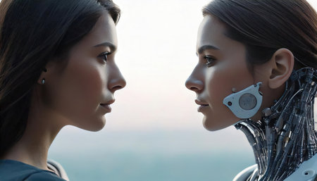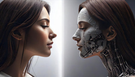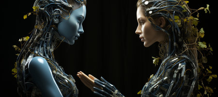 Two female robots looking at each other with eyes closed, conceptual image
