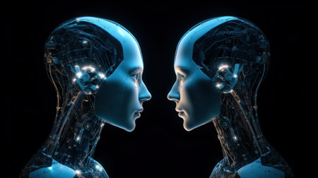 A futuristic close-up of two human faces reflecting each other, with glowing blue circuits and data flowing across their faces, representing artificial intelligence and machine learning.