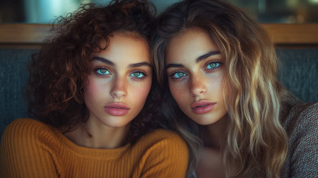 Close-up of two individuals with beautiful blue eyes, one with curly hair and the other with straight, sitting next to each other in a cozy indoor caf with warm lighting.