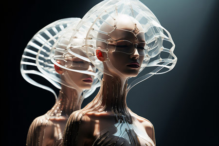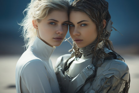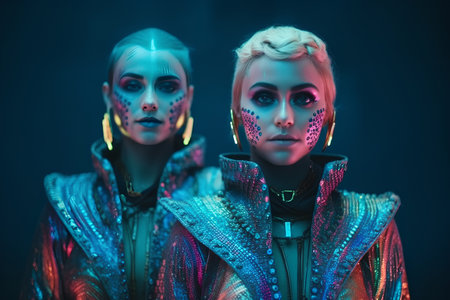 Futuristic and captivating, two female cyborgs glow with neon accents. Perfect for sci-fi projects, tech innovation concepts, or creative design ventures.