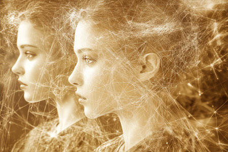 double exposure portrait of two young girls with polygonal connection lines