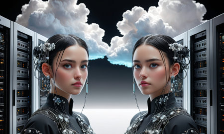 This imaginative digital creation showcases twin-like figures in dark attire amidst server racks, with clouds forming a surreal sky above them. The juxtaposition of advanced technology and the ethereal sky evokes thoughts of cloud computings vast potential.