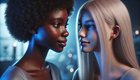 Two women with blonde hair lean toward each other, their faces close, expressing affection and connection. The soft light highlights their features, creating a warm and intimate atmosphere.