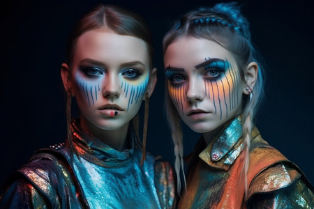 Portrait of two young women in futuristic costumes with bright makeup. Fashion of future.