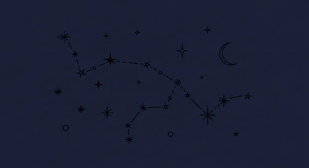 A starry night sky with constellations representing the twelve zodiac signs, each linked by dotted lines, forming a cosmic map in the heavens