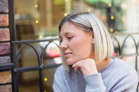 Beautiful caucasian woman in a blue shirt sits at a table in a cafe with a dreamy look