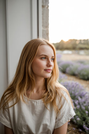 A young woman gazes thoughtfully out of a window, surrounded by blooming lavender under the warm hues of a sunset, exuding peaceful tranquility.