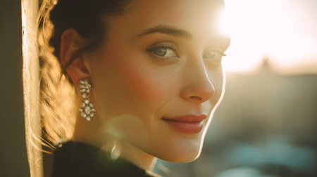 A captivating close-up portrait of a beautiful woman with elegant earrings, set against a bright, sunlit background, showcasing her natural beauty during golden hour.