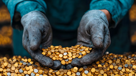 An engineer worker holds gold bars in his hands, checks the quality at the quarry. The concept of an industrial gold mining site