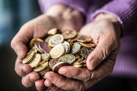 Pensioner woman holding in hands euro coins. Theme of low pensions.
