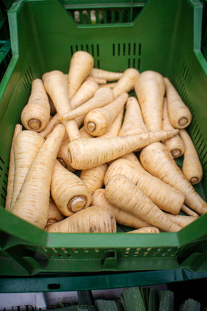parsnips on a regional seasonal market in autumn with local products in Germany, called Herbstmarkt (transl. autumn market)