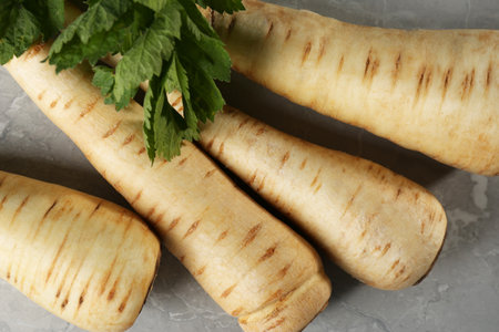 Parsnip roots on gray wooden background. Top view. Flat lay. Harvesting or healthy food concept.