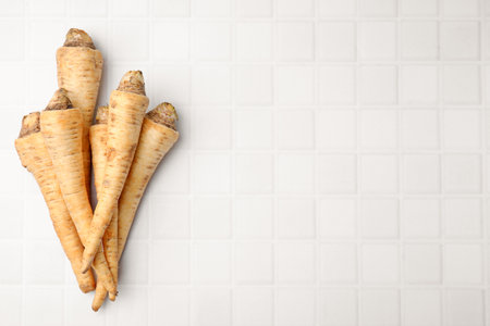 Raw parsley roots, bunch of fresh herb and peeler on white table, flat lay. Space for text
