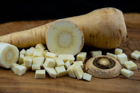 Group of two whole hamburg white parsley root on bamboo cutting board flatlay on grey stone