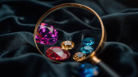 This captivating image features a magnifying glass focused on colorful jewels arranged on rich black fabric. The setup emphasizes texture, brilliance, and elegance, ideal for jewelry marketing.