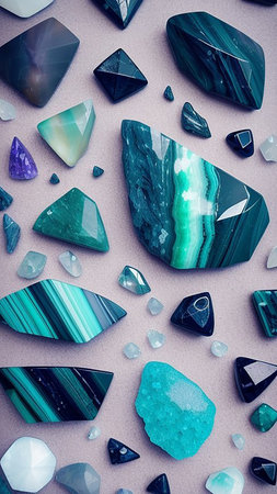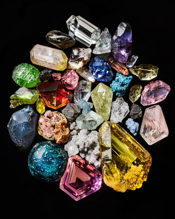 A stunning arrangement of vibrant gemstones in various colors highlights their unique shapes and natural beauty, creating a visually appealing and tranquil composition.