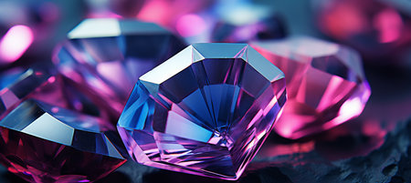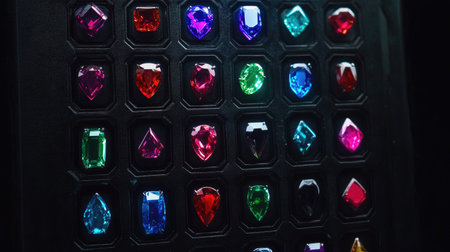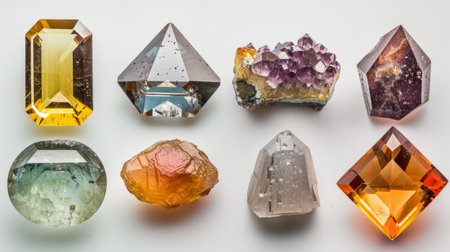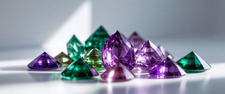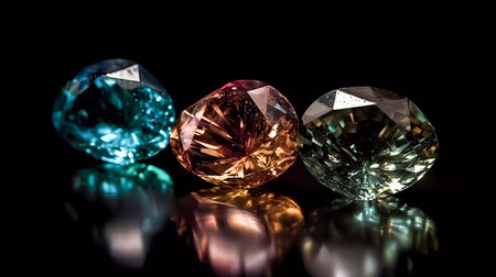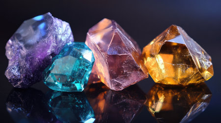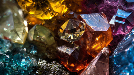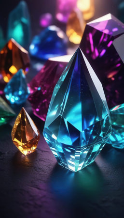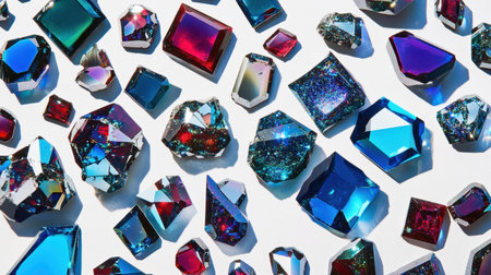 A stunning display of uniquely cut gemstones showcasing an array of colors and intricate reflections, creating an eye-catching and luxurious visual appeal suitable for various design projects.