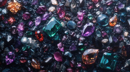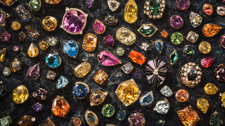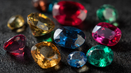 A luxurious display of multicolored gemstones sparkling on a rich dark surface, each cut uniquely to reflect vivid transparency and brilliance
